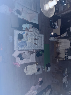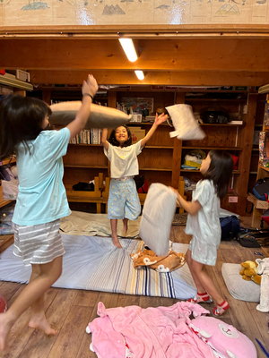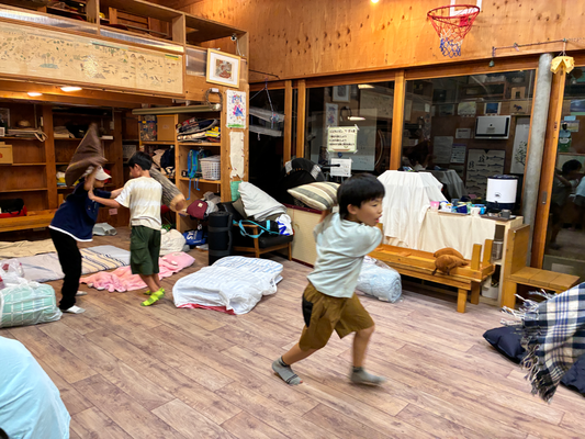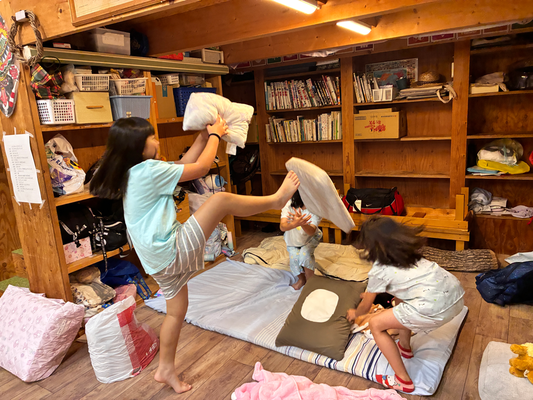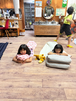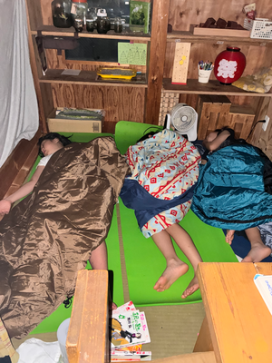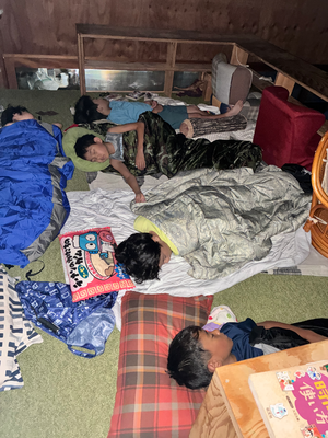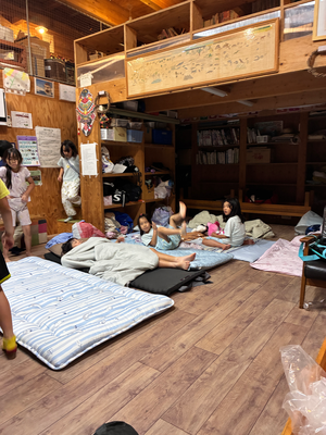 こども園でシャワーを借りて順番に浴びて、戻ってきてから寝る準備!今年もそれぞれ好きな場所でみんなで雑魚寝です!シャワーの順番待ちをしていた男子メンバーは枕投げして大興奮でした!笑