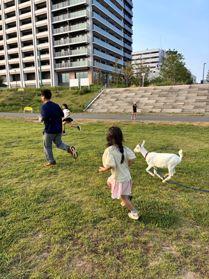 朝から走り回ってバッチリ目が覚めて、散歩(というより鬼ごっこ?)終了!