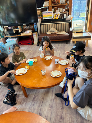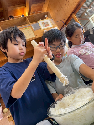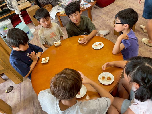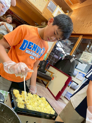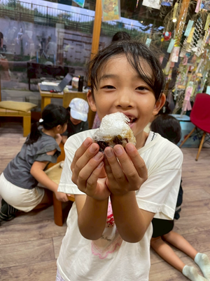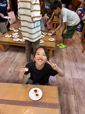 おやつは事前にリーダーたちがみんなにアンケートをとったうえで相談して決めた、みんなの大好物「ごへいもち」!!
