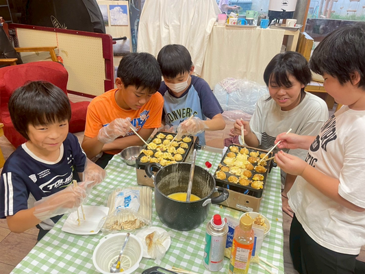 思惑通り、普段はあまり接点のない学童・フリースクールメンバーもごちゃまぜで、みんなでたこやきづくりを協力して楽しむことができて、大成功!