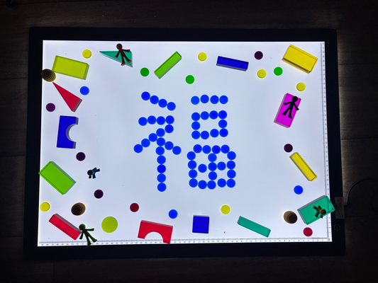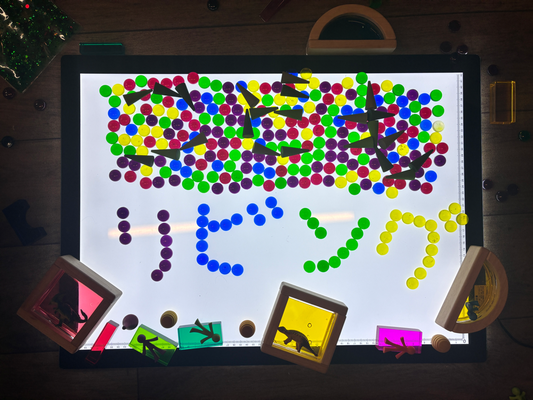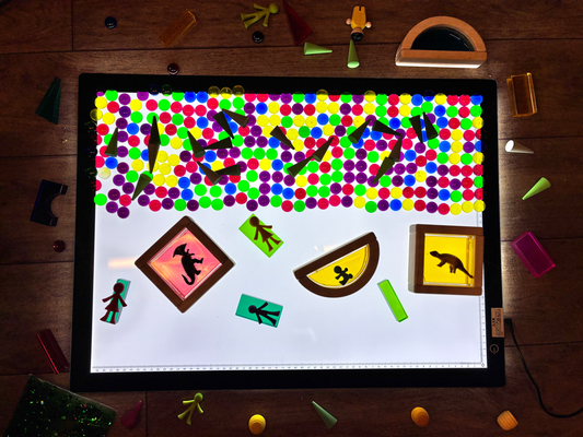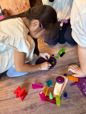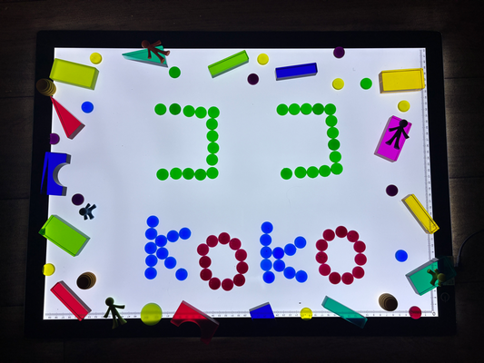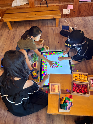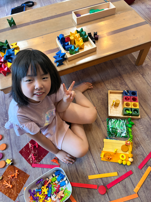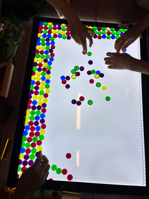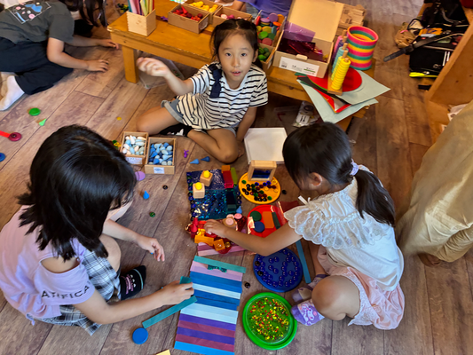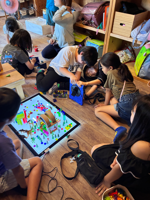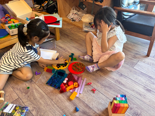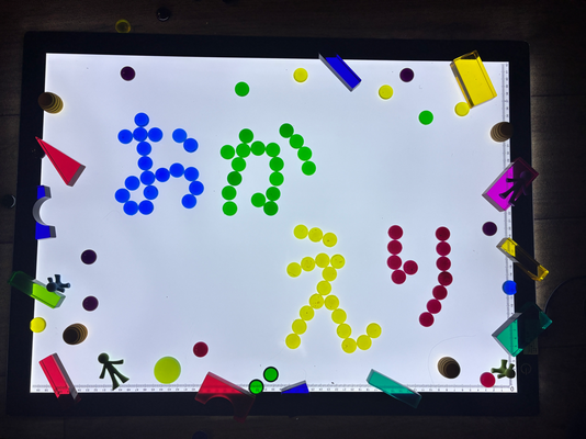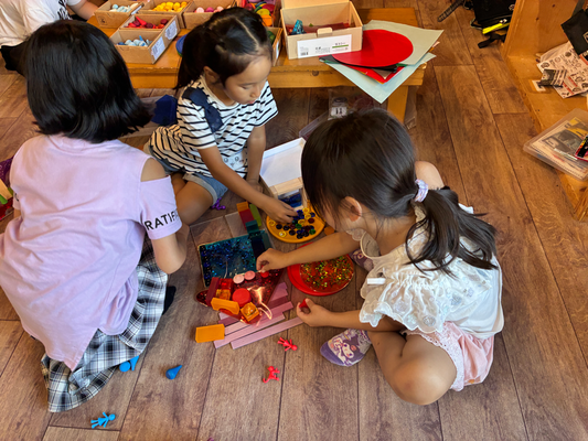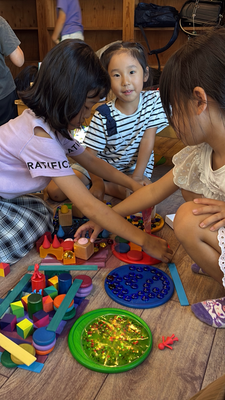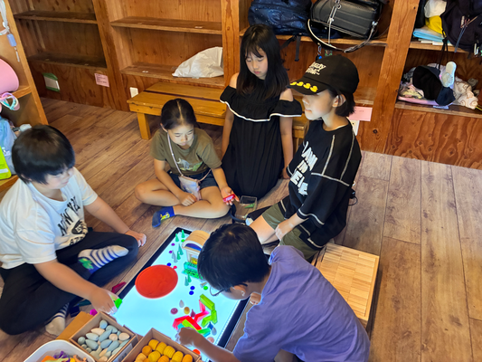 みんなでライトテーブルにつみきを並べて遊んでいたところから、女の子たちがつみきや素材で文字をつくったり可愛く飾って、リビングで使えるいろんな看板を作ってくれました!