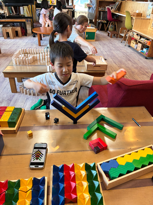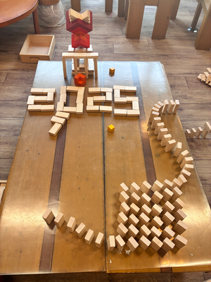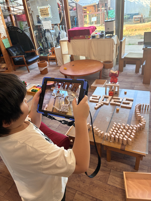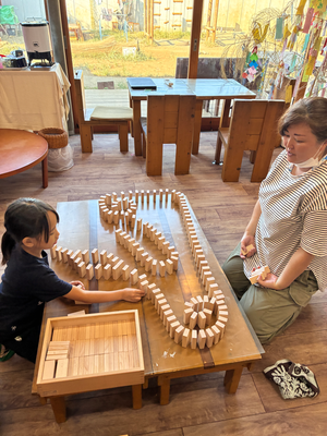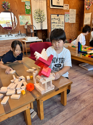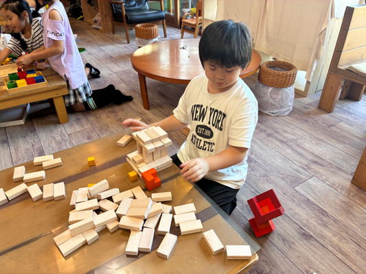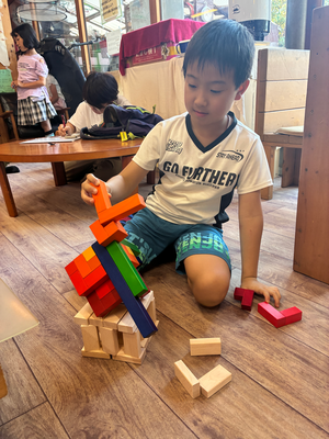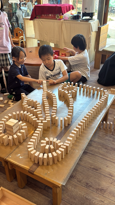 他にも、ドミノづくりをした子がいたり、つみきを組み合わせてオブジェのようなものを作った子がいたりと、多様な遊び方に展開していてとても興味深かったです!連続してつみきあそびワークショップを行なっていますが、みんなの表現の仕方が当初よりも広がってきていることに横尾さんも驚いていました!😊
